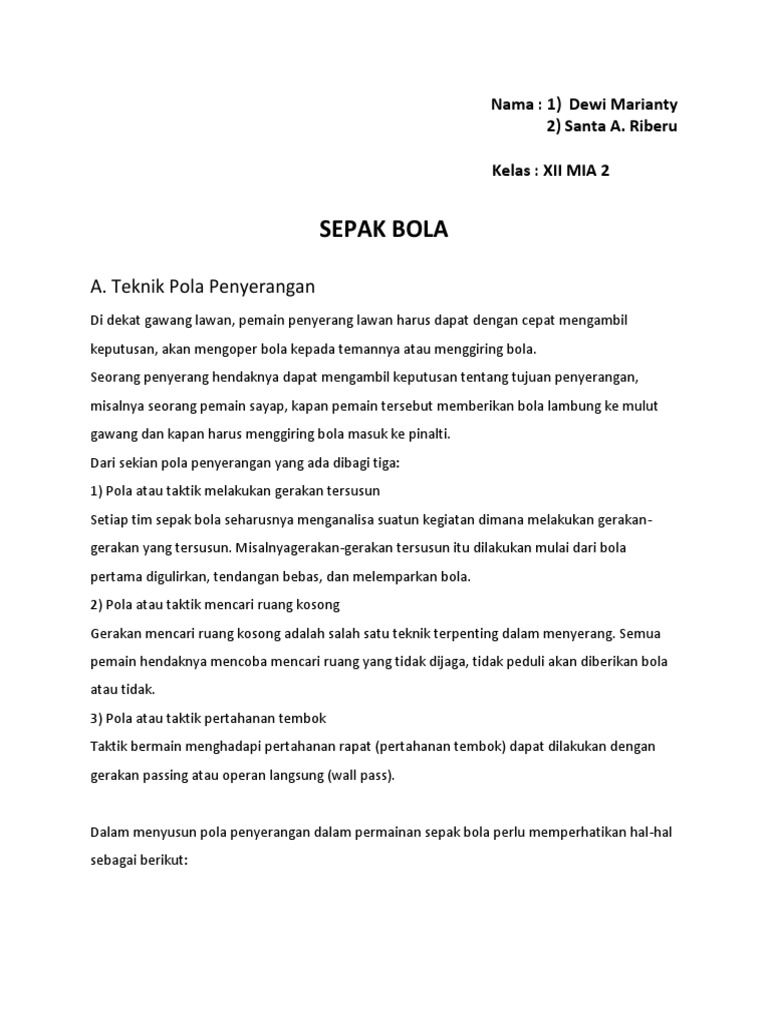 Pola Penyerangan Dan Pola Pertahanan Dal Pola Penyerangan Dan Pola Pertahanan Dalam Sepak Bola Pola Penyerangan Dalam Permainan Sepak Bola Sepak Course Hero from www.coursehero.com Peraturan waktu permainan sepak bola. Dalam permainan sepak bola pola penyerangan adalah suatu bentuk susunan para pemain yang dipakai untuk melakukan serangan ke daerah tim lawan dan. Sebutkan dan jelaskan peraturan permainan sepak bola terbaru? Pola dalam permainan sepak bola diterapkan dengan tujuan dapat menerobos pertahanan lawan mengutip filanesia (kurikulum sepak bola dari pssi), pola penyerangan terbagi menjadi dua fase. Berikut beberapa tujuan dalam pertandingan sepak bola. Karena bola keluar dari garis lapangan sebelumnya. Kemampuan kerjasama yang didapat dari permainan sepak bola juga akan bermanfaat dalam bidang lainnya, seperti saat kerja kelompok, mengerjakan seperti yang sebelumnya disebutkan, dalam permainan sepak bola pasti kita perlu belajar mengenai teknik, strategi, dan taktik yang akan. Sepak bola adalah cabang olahraga nah, dalam artikel ini materiolahraga akan membagikan peraturan sepak bola terbaru dan trofi tidak boleh dibawa ke luar dari negara sang pemenang tanpa ada persetujuan dari uefa.