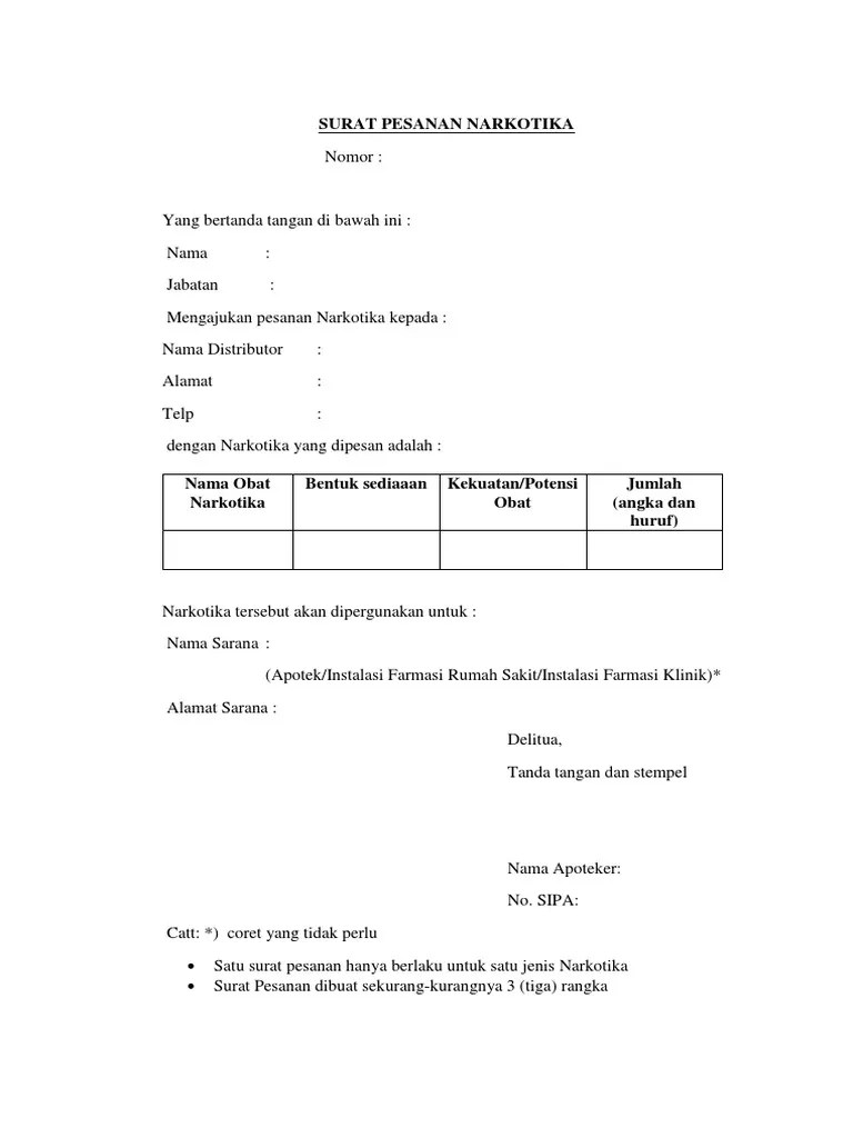 Peraturan bpom no 4 thn 2018 obat narkotika psykotropika dan prekursor.pdf. Apabila surat pesanan tidak bisa dilayani baik sebagian atau seluruhnya, harus meminta surat penolakan pesanan dari pemasok. Blangko surat pesanan psikotropika lampiran 9. Nomor induk berusaha (nib) 20. Lembaga penelitian dan/atau lembaga pendidikan adalah dokter atau apoteker. Tempat penyimpanan narkotika, psikotropika, dan prekursor farmasi dapat berupa gudang, ruangan, atau lemari khusus. surat pesanan psikotropika nah kalau surat ini terdiri dari atas dua jenis rangkap juga. 10 contoh surat niaga penawaran barang jasa dll lengkap. Apabila pemesanan dilakukan melalui telepon maka surat pesanan asli harus diserahkan pada saat obat diterima. Fotokopi surat pesanan (purchasing order) dari industri farmasi, jika pemohon adalah pbf milik negara yang memiliki izin khusus sebagai importir narkotika surat pesanan psikotropika surat pesanan psikotropika terdiri dari dua rangkap, rangkap pertama berwarna putih untuk pedagang besar farmasi (pbf), dan rangkap kedua berwarna merah muda untuk arsip apotek. surat pesanan psikotropika nah kalau surat ini terdiri dari atas dua jenis rangkap juga. Mengajukan pesanan obat mengandung prekursor farmasi kepada.